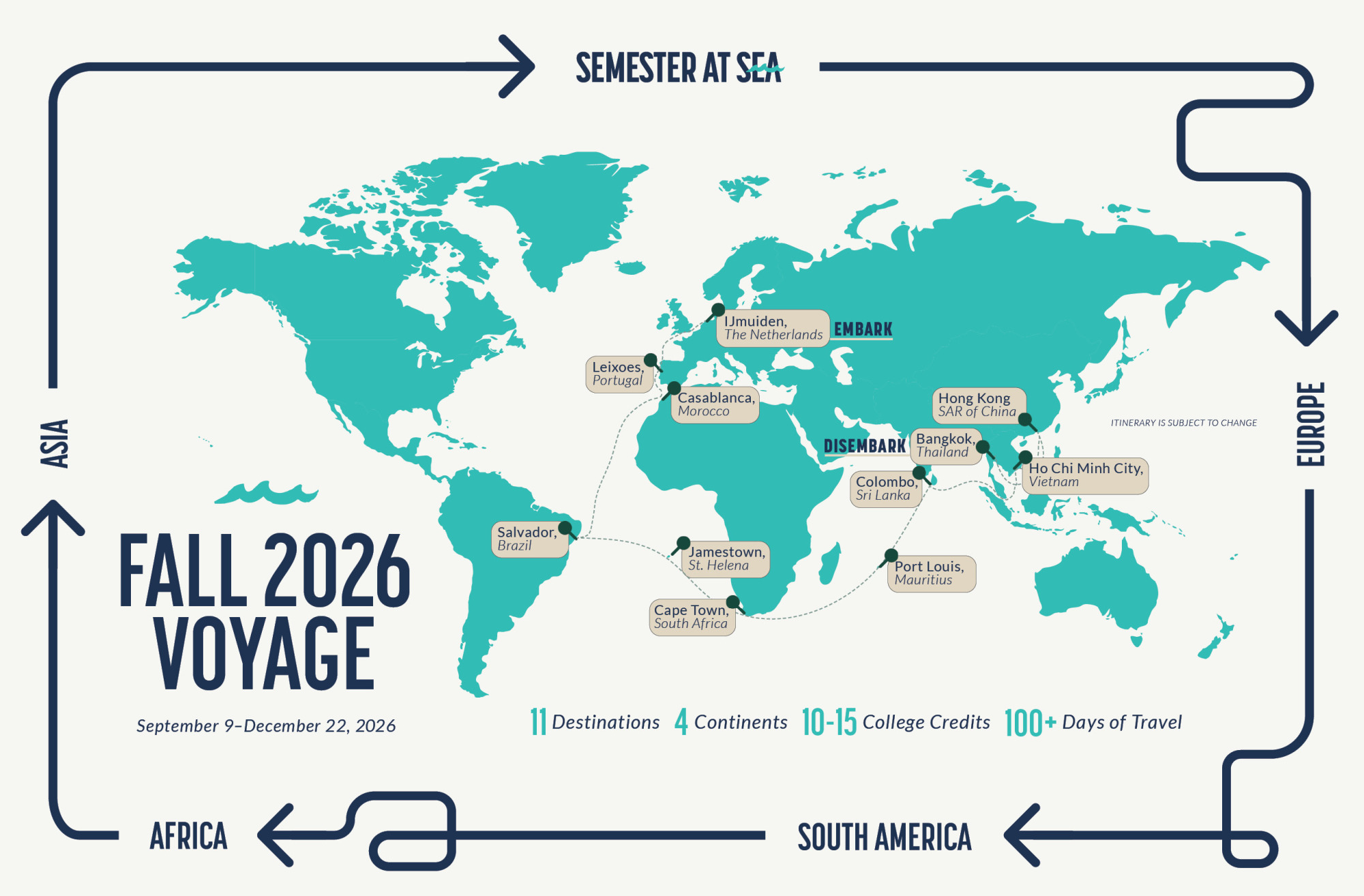 This is a redesigned voyage map that aligns with brand guidelines and presents the information in an engaging, clear, and easy-to-read format. As a flagship piece, it's prominently featured on Semester at Sea's website and is printed for sharing at various fairs across the globe.
